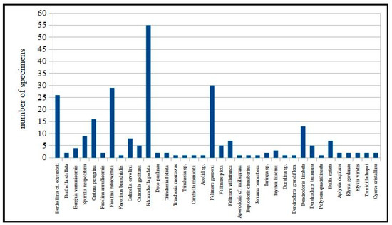 This study revealed that the most representative sea slug group in the area was the order Nudibranchia (28 species). The temporal variations in the number of species within this group can provide valuable insights into the seasonal dynamics of the marine waters of a given coastal area [48]. Similarly, some inferences can be drawn regarding this coastal area.