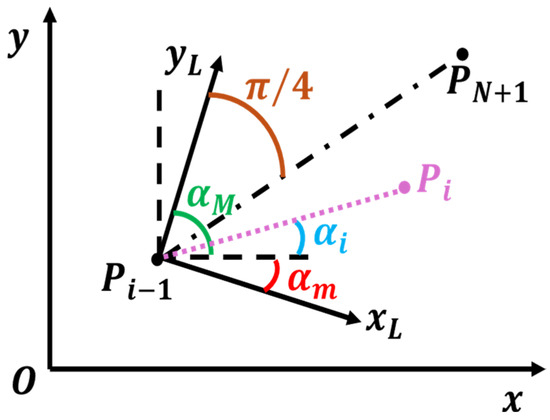 In order to achieve a more effective solution for route planning, it is advantageous to employ a local reference system for defining the coordinates of each waypoint. Each point can be described in terms of its direction and distance relative to the preceding waypoint rather than using absolute coordinates. This method simplifies the definition of constraints on the distances between waypoints and the changes in direction, thereby preventing the generation of inefficient trajectories with intersections or backward movements. Using a local reference system ensures a more structured and feasible approach for defining the path from the starting point to the destination.