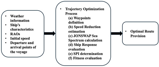 - Input data reception—Initially, the procedure receives crucial input data, including weather information, vessel details (such as dimensions, response amplitude operators, and added resistance values), initial speed, and specific coordinates for the departure and arrival points of the trip.