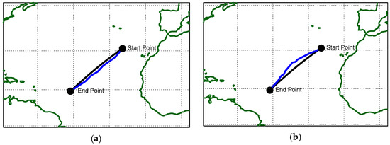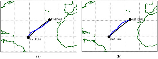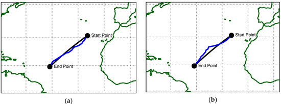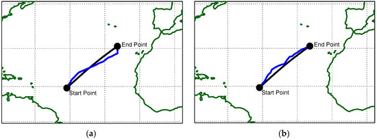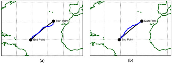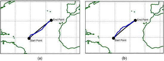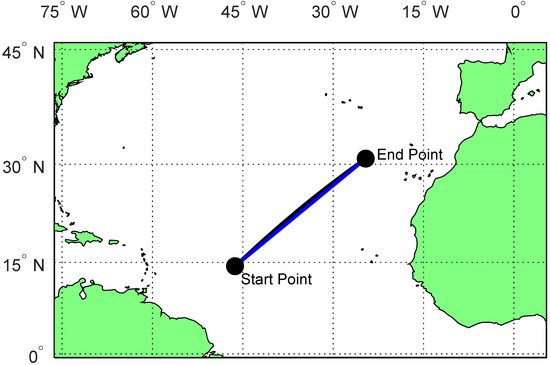 The selected route is in the North Atlantic Ocean, one of the most important shipping zones in the world, being the corridor where all the infrastructure of Western Europe’s key ports has been regularly and significantly upgraded to keep up with current and anticipated increases in shipping. Weather conditions in this area can vary through the seasons and affect the final outcomes. The coordinates of the departure point are 14.4° N 46.3° W, and the target is at 30.8° N 24.6° W. Figure 3 presents the selected route to be followed, showing the great circle distance between points. The great circle route is 1549 nm long, and the rhumb-line route is 1555 nm long. Although the great circle is shorter, it requires the captain to correct the heading frequently. On the other hand, rhumb-line, although a little longer, does not require changes in the absence of wind and sea current, making it more practical.