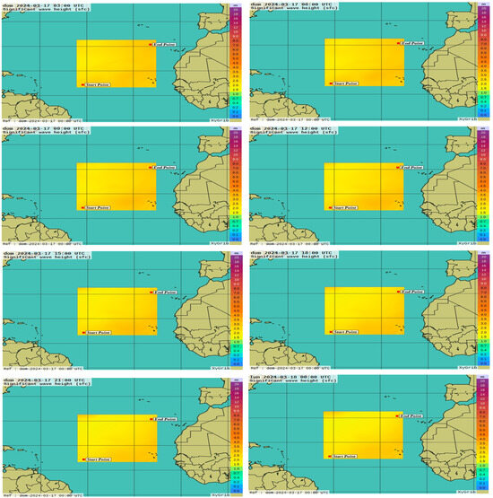 In this study, the GRIB files were downloaded with a time step of 3 h and a duration of 7 days for each sequence from 17 March to 24 March 2024, with 0.25° × 0.25° grid spacing. An example of the meteorological images that depict changes in environmental conditions during a certain period in the selected patch can be seen in Figure 4, which contains a photo series of GRIB files showing the trend of the significant wave height from 03:00 UTC on 17 March 2024 up to 00:00 UTC on 18 March 2024. In particular, the significant wave height is defined as: