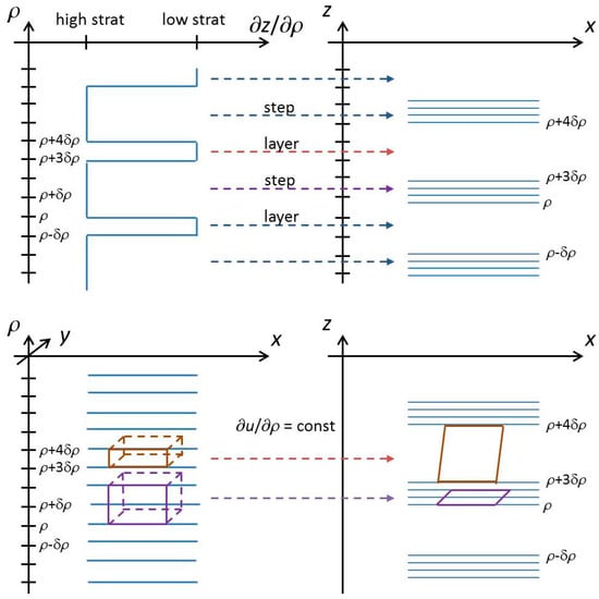 Schematics of flow deformation in Cartesian and isopycnic coordinates. (Top left) Imagine the water column is split in high- and low-stratified regions, characterized by small and large values of in the isopycnic representation, (Top right) which corresponds to the steps and layers in Cartesian coordinates. Let the entire water column experience a constant diapycnal shear , and (Bottom left) explore what will happen to material water volumes defined in the isopycnic representation. (Bottom right) When viewed in the vertical domain relatively large material volumes located in layers will experience low deformation while much smaller volumes within steps will experience high deformation.