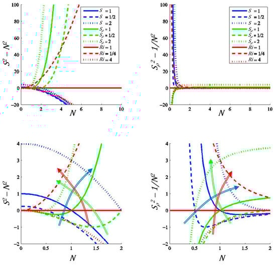 (Left panels) Nondimensional reduced squared vertical shear and (Right panels) nondimensional reduced squared diapycnal shear , in both cases plotted as a function of stratification . Red curves stand for different Ri values, blue curves for different values and green curves for different values; the dashed, solid and dotted lines correspond, respectively, to values less than, equal to and greater than one. In the top panels, we present the results in the [0:10, 0:100] domain, while in the bottom panels we zoom into the [0:2, 0:4] domain; the colored arrows illustrate the direction where the flow becomes subcritical (Ri decreasing) and the shear increases.