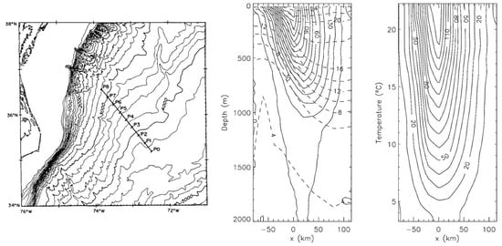 (Left panel) Location of the velocity and temperature stations (P0 through P8) across the Gulf Stream, off the east coast of North America, with the bottom isobaths. Reproduced with permission from Halkin and Rossby, J. Phys. Oceanogr; published by American Meteorological Society, 1985 [28]. (Middle panel) Vertical section of the along-stream mean velocity (solid contours in cm s−1) and the temperature in (dashed contours in °C). (Right panel) Along-stream velocity as a function of temperature. Reproduced from [29].