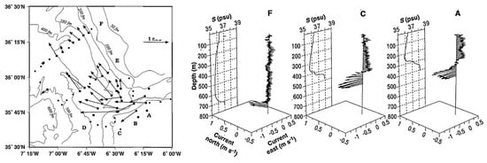 (Left panel) Location of most stations with conductivity and velocity data used in our analysis, with vectors illustrating the peak Mediterranean outflow velocity; some additional stations inside the Strait of Gibraltar are not shown. (Right panels) Examples of velocity and salinity vertical profiles along the outflow axis of sections A, C and F (see left panel for the location of each section). Reproduced with permission from Price et al., Sci.; published by AAAS, 1993 [30].