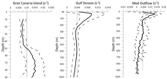 The permanent thermocline of the GS, with temperatures between about 6 and 16 °C, slopes sharply towards the continental slope, rising some 600–700 m in 100 km. As a result, the GS core velocities increase from about 0.25 to more than 1.5 m s−1 over this same temperature range. On both sides of the GS core, the mean vertical stratification remains similar but the velocities are substantially smaller (Figure 5, middle panel). The relatively low vertical data resolution limits the sampling of high-shear events associated to internal waves, which would be responsible for a significant increase in the gradient Richardson values, and hence restricts our analysis to near-geostrophic flow [9]. Despite this, the background geostrophic velocity field is intense enough for the core of the GS to experience several instances of subcritical conditions (Ri < 1) which are responsible for vertical mixing [12,34]. The buoyancy frequency decreases largely in the top 300 m and remains approximately constant down to 1000 m, with low variability characteristics for the subtropical permanent thermocline. The mean buoyancy frequency for this second dataset is 0.004 s−1 (Figure 7, middle panel).