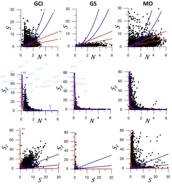 Consider first the cloud points for the nondimensional vertical stratification, vertical shear and diapycnal shear (Figure 8), in particular the zoom for the high stratification and high shear domain (Figure 9). The overall shape of S against N changes greatly in all three cases, with no noticeable dependence of vertical shear on stratification. The common denominator in all three cases is that S takes a relatively high range of values for any N (Figure 8 and Figure 9, top panels). In contrast, all against N cloud points have similar shapes, with relatively high values and high variability in low stratification conditions and the opposite for well-stratified waters (N > 3) (Figure 8 and Figure 9, middle panels); these cloud points actually suggest a decay of the maximum diapycnal shears with increasing vertical stratification. Finally, the against S scatter plots also display very large differences between all three cases, with the GCI and GS cases displaying completely different distributions and the MO possibly as an intermediate situation (Figure 8 and Figure 9, bottom panels).