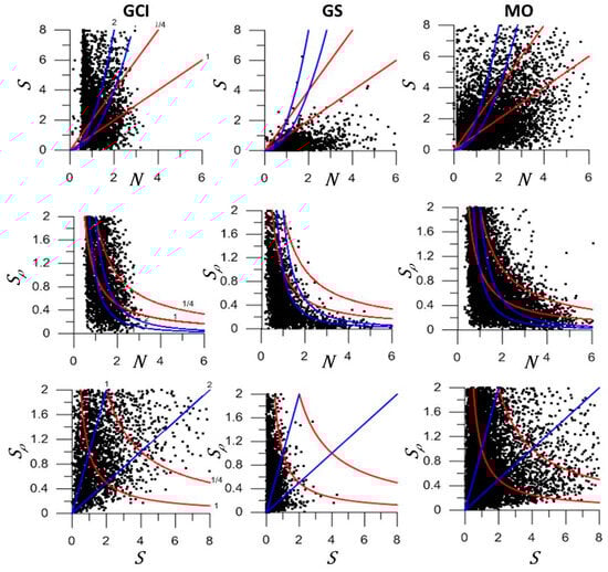Scatter plots of nondimensional variables: (Top panels) S as a function of N, (Center panels) Sρ as a function of N and (Bottom panels) Sρ as a function of S. The three columns correspond to the three datasets: (left panels, GCI) Gran Canaria Island shelf break, (middle panels, GS) Gulf Stream and (right panels, MO) Mediterranean outflow. The red lines correspond to contours of Ri = 0.25 and 1. The blue lines correspond to contour values of 1 and 2 for (Top panels) Sρ, (Center panels) S and (Bottom panels) N.