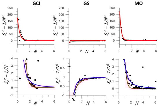 Scatter plot of nondimensional mean plotted as a function of N; the lower panels reproduce the top panels but zooming into the (Left and Right panels) and (Middle panel) intervals. The red and blue lines respectively correspond to the exponential and Ri-based fits (see text for explanation). The three columns correspond to the three datasets: (left panels, GCI) Gran Canaria Island shelf break, (middle panels, GS) Gulf Stream and (right panels, MO) Mediterranean outflow.