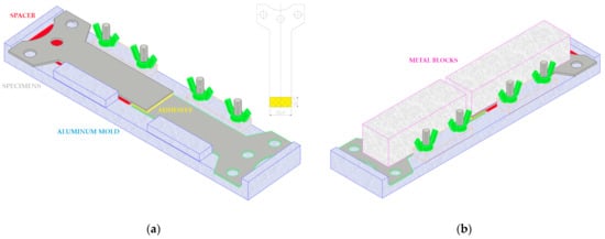 (a) Aluminum mold to ensure correct dimensions of the adhesive single-lap-joint according to ASTM D1002. (b) The curing of the adhesive bond is achieved through the application of metal block weights and pressure.