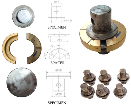 Specimen manufacturing: The manufacturing process was conducted in accordance with the specifications set forth in the ASTM D897 standard [,], ensuring that the shape and dimensions of the specimens met the defined criteria. Prior to the addition of the adhesive, each specimen was meticulously cleaned with acetone. The 1 mm thickness of the joint is assured with a spacer. The curing of the adhesive bond is achieved through the application of a tight clamp to the assembly for a period of 72 h. The overlap adhesive bond diameter is 28.68 mm, with the tensile area being 646 mm2 []. See Figure 2.