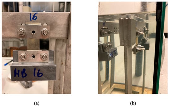 Adhesive samples were immersed in seawater under two different load conditions: 0% and 6% of the tensile strength. The aging process was conducted until full saturation at room temperature for a period of 312 h for the 0% condition and 522 h for the 6% condition. The majority of the gravimetric weighing was carried out at 24 h intervals; refer to Section 3.3.1 for further details. The experimental setup is fully described in previous work by the author []. See Figure 3.
