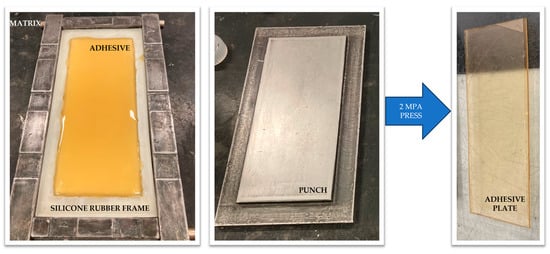 Specimen manufacturing: The blending of the two adhesive components was carried out in a 1:1 ratio, ensuring mixing by means of a centrifuge machine. As the resulting blend was significantly viscous, the method chosen for manufacturing the adhesive plates was the French standard NF T 76-142 []. This technique is well described by da Silva et al. [], in previous works by the author [,,], and in other studies [,,]. It consists of inserting the adhesive into a mold, enclosed with a 1 mm thick silicone frame, ensuring the correct thickness of the desired adhesive plate and avoiding the production of bubbles (Figure 4). Therefore, the curing of the adhesive is performed at room temperature for more than 72 h in the mold under high pressure (2 MPa). Then, after that, the adhesive specimens required for bulk tests were cut from the manufactured plate according to the dimensions needed.