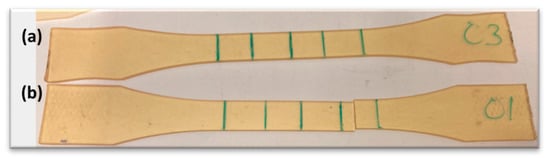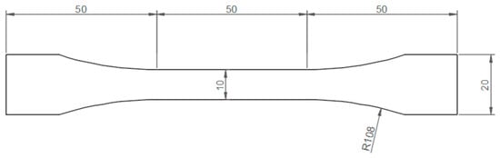 Standard “dog-bone” specimens, in accordance with the dimensions set forth in British Standard BS 2782 [,], were prepared. Additionally, reduced-scale specimens of rectangular shape were produced. This was done because the dimensions of the standard ones are not manageable for the aging test, as they are too large for the seawater containers and immersion times required. This procedure has been conducted and validated in several studies previously [,,,]. Therefore, standard “dog-bone” tensile specimens were prepared by machining 2 mm thick plates (ISO 2818) [], with dimensions of 150 mm in length, 10 mm minimum at the narrowest part, and 20 mm maximum width in each grip area (Figure 5). Reduced-scale rectangular specimens were manufactured by manually cutting 1 mm thick plates 60 mm in length and 10 mm in width. Prior to testing, all specimens were checked for dimensions with a caliper. In the case of aged specimens, in addition to this dimensional check, the surface was dried with a paper towel before testing at room temperature.