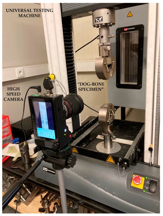 Bulk tensile tests: A setup consisting of a universal testing machine for obtained loads and a Digital Image Correlation system (DIC) [] to measure displacements has been used for testing (Figure 6). Specifically, an Instron® universal testing machine model 3367 with a load cell capacity of 30 kN (Norwood, MA, USA) and a Chronos 2.1-HD high-speed camera from Kron Technologies Inc. (Burnaby, BC, Canada) equipped with a 24 mm F1.4 full frame wide angle lens from LK Samyang Optics (Changwon, Republic of Korea).