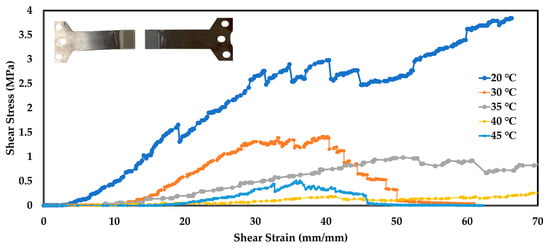 Figure 8 shows the reduction in the shear stress when the temperature rises. It should be noted that the behavior at 40 and 45 °C overlaps since these test temperatures are higher than the Tg (33.7 °C, determined by DSC, as illustrated below in Section 3.3.3, on a dried specimen of adhesive).