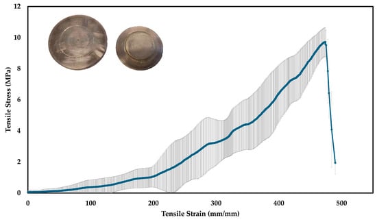 Average strain–stress curve under tensile deformation with standard deviation. An illustrative example of a tested specimen has been included.