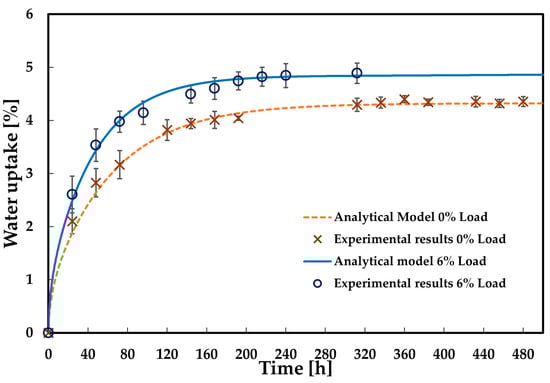 A comparison between analytical curves calculated with the Fick model and experimental results achieved from gravimetric analysis for the two constant loading conditions (0 and 6%) are shown in Figure 10. The standard deviation for the experimentally obtained data is displayed. This plot represents the percentage of water absorption (with respect to initial mass) against time. There is a good correlation between experimental data and analytical results according to Fick’s law model. It is observed that when the 6% condition load is applied, the adhesive absorbs more seawater.