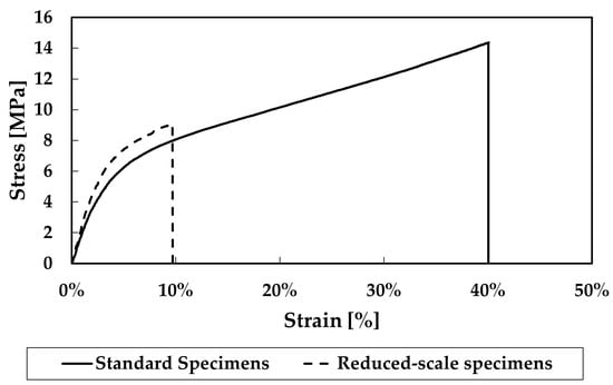 With the intention of validating the use of reduced-scale specimens, a comparative stress vs. strain diagram including standard “dog-bone” specimens is shown in Figure 12. Also, the mechanical properties are compared in Table 2.