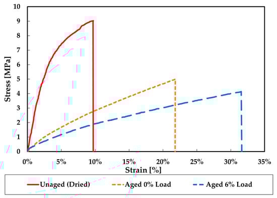 Representative stress–strain plots for unaged (dried) and aged specimens with 0% and 6% constant load conditions are shown in Figure 13.