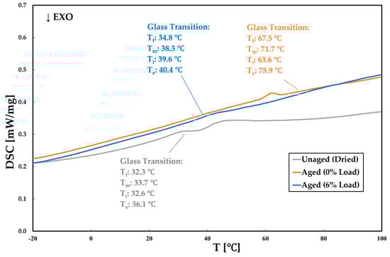 The results of the DSC analysis are displayed in Figure 14. The glass transition temperature (Tg) occurs over a range of temperatures. The software used with the DSC machine automatically determined the extrapolated onset temperature (Tf), the midpoint temperature (Tm), the inflection temperature (Ti), and the extrapolated end temperature (Te). In accordance with ASTM E1356-08 [], the midpoint (Tm) was selected as the Tg value, calculated as the average between Tf and Te. This is because it is the most widely used, as it is constructed closer to the middle of the temperature range where the glass transition occurs. In the aged specimens, the Tg values are 71.7 °C for the 0% load condition and 38.3 °C for the 6% load condition. The unaged (dried) sample presents a Tg of 33.7 °C.