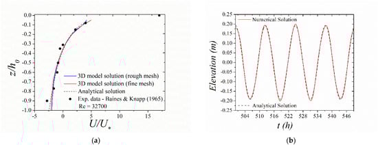 Model validation with experimental data [13] and/or analytical solution: (a) normalized velocity profile in a rectangular closed basin due to wind-induced flow and (b) free-surface elevation in a rectangular semi enclosed basin due to tidal flow.