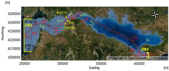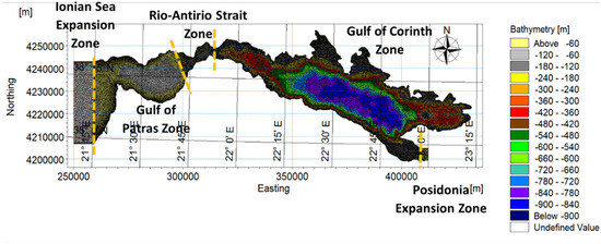 For the geometry generation of the gulfs system, HGRS87 (Hellenic Geodetic Reference System 1987) (Greek grid) zone projection was selected. The numerical domain covers the entire gulfs’ system as well as part of the adjacent Ionian Sea on the west. The domain was divided, regarding mesh dimension, into five discretization zones from west to east: the Ionian Sea expansion, the main area of the Gulf of Patras, the wider area of Rio–Antirio strait, the main area of the Gulf of Corinth, and the Posidonia expansion. The open boundaries (OB) have been set at sites where tidal harmonic constituents are available, i.e., at Mauromiti Station [14] and Posidonia Station [15] in the west and east of the system, respectively. The dimension of cells lies between 250 and 1000 m for each zone except of the zones of Rio–Antirio Strait, and the Posidonia where the dimension lies between 250 and 500 m, and in all cases gradually increases offshore (Figure 3).