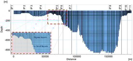 The numerical domain consists of 41,048 cells (or 21,784 nodes). For the vertical mesh, a combined sigma and z-level type mesh was applied with 15 layers of sigma mesh covering the first 140 m depth and 25 layers of z-level mesh with constant grid spacing 30 m for deeper areas of the system, as shown in the cross section nearly along the thalweg of the whole system (Figure 4 and Figure 5). The depth of 140 m is adopted for the σ-layer that covers the entire depth of the Gulf of Patras and the upper part of the Gulf of Corinth waters. In the deepest parts of the Gulf of Corinth, i.e., from 140 m up to 900 m, a Cartesian mesh was applied. A time step of 1 min was required to satisfy the Courant–Friedrichs–Lewy (CFL) criterion and avoid divergence.