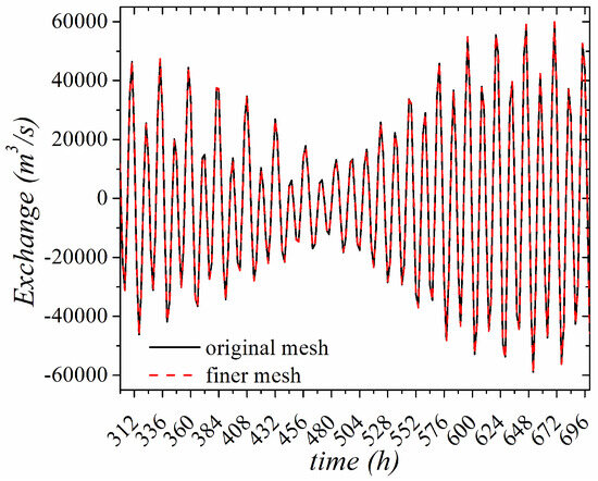 The exchange flowrate at the Rio–Antirio strait is presented in Figure 6 for both mesh cases. The numerical results indicate that the horizontal discretization of the original mesh is sufficient to capture well the flow development in the examined system.