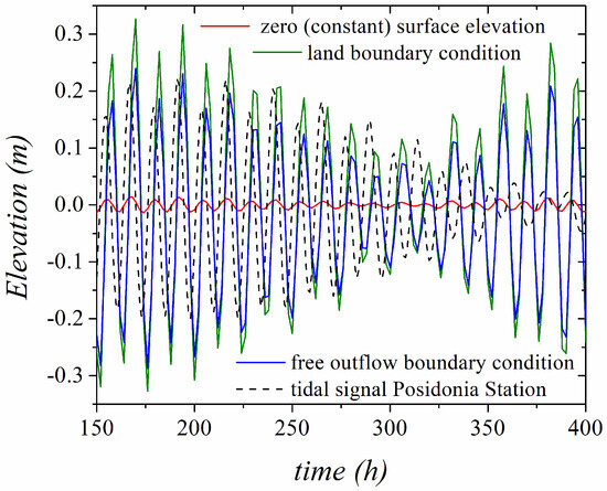 The numerically predicted results given in Figure 7, below, show different cases of eastern open boundary (OB2) treatment, compared to the corresponding harmonic tidal signal at Posidonia Station. It is obvious that no boundary condition considered can reproduce the tidal signal that ultimately gave the harmonic tidal signal at Posidonia Station. We therefore conclude that the harmonic tidal signal of Posidonia Station should be considered for the eastern open boundary (OB2) as the more appropriate boundary condition for the system’s simulations. It is mentioned here that the tidal gauge of Posidonia Station is located in the eastern part of the Gulf of Corinth, at the western end of the Corinth channel, inside the harbor basin of the Posidonia Port [17].