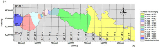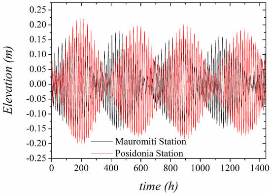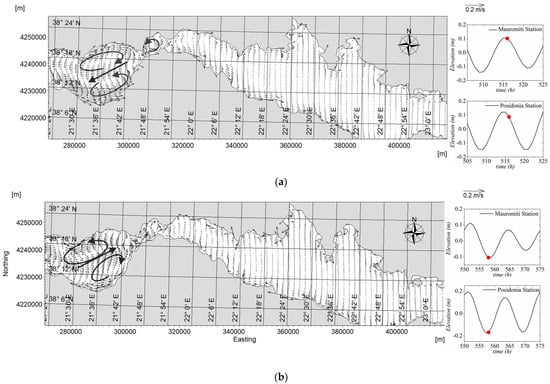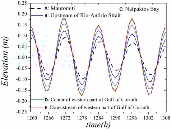 In this section, the tidal circulation in the gulfs’ system is given in detail. The free surface formation in the system shows the tidal propagation leading to the formation of a nearly standing wave, which can also be inferred by comparing the time series of the simulated tidal elevation at characteristic sites of the gulfs: (A) the entrance of the system (Mauromiti); (B) upstream of the Rio–Antirio strait; (C) the cove of Nafpaktos Bay; (D) the central area of the western part of the Gulf of Corinth as well as its ending; (E) (Figure 4, Figure 9 and Figure 10). Based on the simulations, it is shown that the tidal wave at the system’s body up to the end of the western part of the Gulf of Corinth leads to an 85% increase in tidal amplitude, compared with the tidal signal at the entrance of the system (i.e., Mauromiti Station).