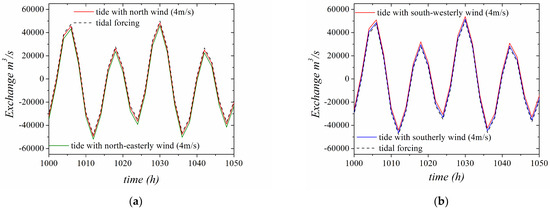Moreover, the numerical results show that the prevailing winds, i.e., SW and NE winds, favor or oppose the flow in the case of the combined tidal forcing and the wind. Comparing the exchange flowrate under the action of the tide and winds blowing from N and NE with just the tidal flow, it is shown that all these winds oppose the exchange flowrate between the gulfs. On the other hand, the action of S and SW winds favor the exchange flowrate (Figure 12a,b).
