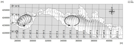 During the transition of tidal flow, characteristic phenomena are generated in the horizontal structure of the flow. For the simulated barotropic flow, a cyclonic eddy forms at the central part of the Gulf of Patras, reported in the literature [5,20] as a feature of the summer (baroclinic) circulation in the Gulf of Patras. A cyclonic gyre was also simulated for the Bay of Nafpaktos during the change from flood to ebb tide, affecting mainly the northwestern coasts of the bay and attaining current values in excess of 0.5 m/s, in agreement with observations from a campaign by Hatjitheodorou et al. [21].