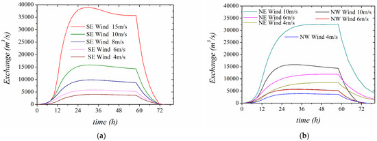 Exchange flowrate up to a steady state simulation (~2 days) before the windbreak for (a) SE winds of 4–15 m/s speed and (b) NE and NW winds of 4–10 m/s.