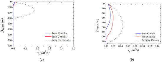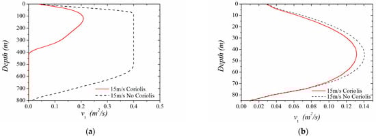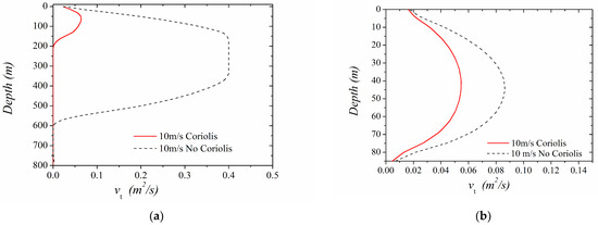 It is worth noting, however, that for strong winds, i.e., 10–15 m/s, and since the Gulf of Patras is a depth-restricted basin (max depth < Ekman Depth), the Coriolis seems to be attenuated with increasing wind speed. In this case, the parabolic-like structure of the vertical eddy viscosity covers nearly the whole depth of the Gulf of Patras basin, and the mode of the flow is shifting towards an open-channel rather than a geophysical flow (Figure 16 and Figure 17). In Figure 15, Figure 16 and Figure 17, the vertical eddy viscosity for different wind speeds is given and the results are compared with the corresponding theoretical case where the Coriolis effect is not taken into account. In Figure 15 (light and moderate winds), the effect of rotation on the flow structure is evident, while the Coriolis effect seems to be restricted by the wind intensity and basin depth for strong winds of 10–15 m/s (Figure 16 and Figure 17).
