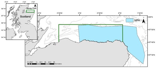 The location of the Moray Firth study area (green border) and the boundaries of the Southern Trench MPA along the southern coastline of the outer firth.