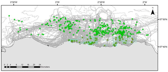 Showing the spatial distribution of feeding/foraging minke whales (n = 458) recorded during dedicated boat-based survey work (track lines in grey) along the southern coastline of the outer Moray Firth from May to October 2009 to 2022 inclusive.