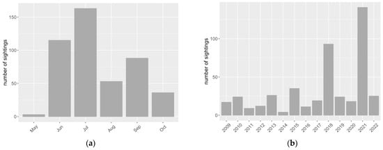 The spatial distribution of feeding/foraging minke whales encountered in the study area between May and October 2009 to 2022 is shown in Figure 2. Whales were encountered throughout the study area but were more generally distributed towards the central and eastern areas of the study site, with a greater number of encounters offshore. Sightings were recorded from May to October inclusive (Figure 3a), but considerable variation was observed in the number of sightings from one month and from one year to the next (Figure 3a,b, respectively), with the highest number of sightings being recorded in 2018 and 2021 (Figure 3b).