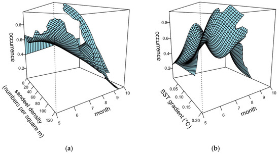 The tensor product interaction (ti) between burrowed sandeel density (BSD) and month was found to have a strong significant effect (Table 2), with feeding/foraging minke whale presence being strongly associated with high BSD levels during May and June but declining in the consecutive months thereafter. From May to July, feeding/foraging minke whale presence was much lower at low sandeel densities than at high sandeel densities but was similar in August and considerably higher at low BSD than at high BSD in September and especially October (Table 2; Figure 4a). The tensor product smooth (te) between sea surface temperature standard deviation (SST SD) and month was also found to have a very strong significant effect, with feeding/foraging whale presence between June and August being strongly influenced by high SST SDs (i.e., thermal fronts), although apparently also to a lesser degree at low SST SDs during the same period. By September and October, feeding/foraging whale presence very steeply declined, particularly at high SST SDs (Table 2, Figure 4b).