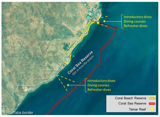 We suggest that the observed shift in dive routes can be attributed to factors beyond the AR’s deployment. Since 2011, the Israel Nature and Parks Authority (INPA) has implemented regular briefings in which a marine ranger meets with instructors from diving clubs in Eilat and presents principles for responsible diving. Among other things, the ranger presents a map showing diving areas suitable for different types of diving (Figure 1). Note that the figure explicitly requires that introductory dives be conducted in two defined areas, one of which is outside the MPA in the area where the AR is located (marked by a yellow star) and the other of which is an area inside the MPA where there is a robust sandy area, following the recommendations of Zakai and Chadwick-Furman (2002) [2]. These briefings request that dive instructors avoid conducting introductory and trainee dives within the MPA. Therefore, the observed shift in dive routes is likely a result of these educational efforts, rather than solely the presence of the AR. It is important to note that the division into diving areas is not strictly mandatory, but most dive guides openly sympathize with the desire to protect the coral reefs in Eilat and therefore comply.