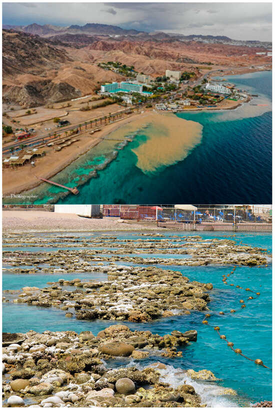 Damages to the northern part of the fringing reef inside the MPA [the reef mentioned in Shashar et al. (2024) [1]], caused by (top) a flash flood from the mountains of Eilat that carry into the sea both road leachate and huge amounts of sediments that covers the reef (Photo by Chen Toufikian), and (bottom) an extreme low tide event that exposes the upper part of the fringing reef.