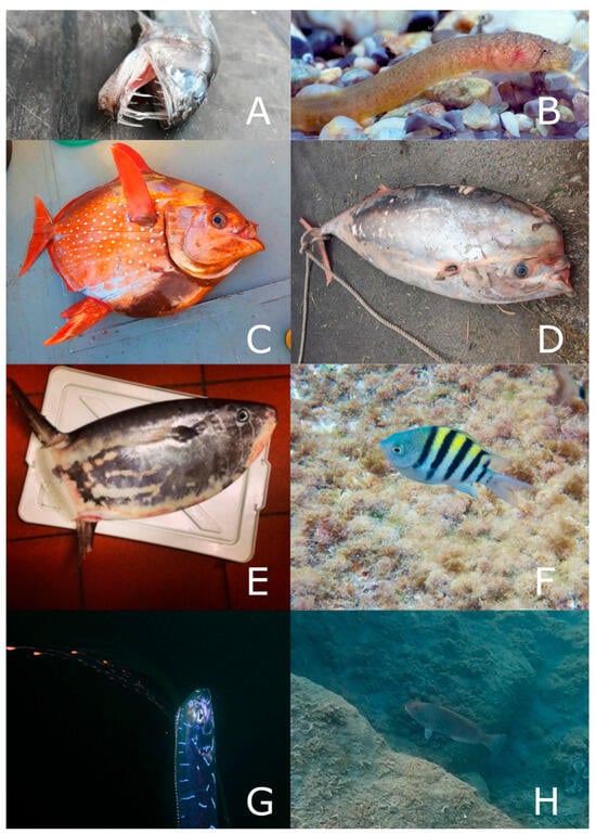 Observed specimens of (A) Evermannella balbo (photo by Simone Auditore), (B) Gouania willdenowi (photo by Roberto Sindaco), (C) Lampris guttatus (photo by Federico Rametta), (D) Luvarus imperialis (photo by Stefano Porrozzi), (E) Ranzania laevis (photo by Diletta Gabrielli), (F) Abudefduf sp. (photo by Francesco Caroli), (G) Regalecus glesne (photo by Thomas Menut/Biotope), (H) Sparisoma cretense (photo by the first author).