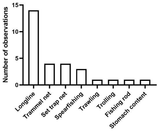 The methods of observation (Figure 3) were photography (18 observations, of which 1 was a beached specimen of L. imperialis, 1 was a floating, dead specimen of D. licha, and 16 were live specimens of other species photographed underwater), longline (14 observation, of which 4 were recorded by drifting longlines and 10 by an unspecified type of longline), trammel nets (4 observations), set trap nets (the ‘tonnarella’ of Camogli, see [16], 4 observations), spearfishing (3 observations), trawling (1 observation), trolling (1 observation), fishing rod (1 observation), and stomach content analysis (1 observation).