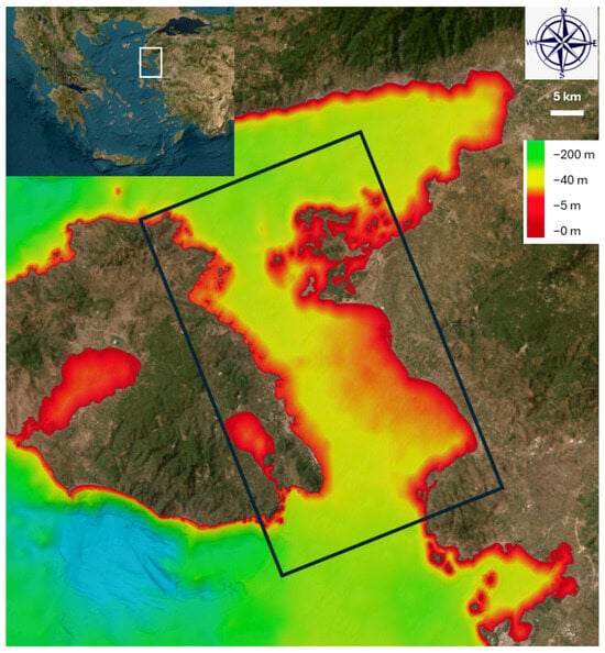 A map of the study area (white outline) of the Eastern Aegean Sea, where commercial bottom trawling for the collection of elasmobranch species was conducted (black outline) (26.40°–26.80° E, 39.05°–39.30° N). Color variation indicates depth.