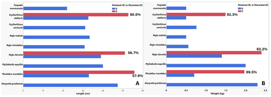 (A) The mean length and (B) the mean weight of each elasmobranch species captured between September 2022 and October 2024 in the Eastern Aegean Sea. Percentages indicate retention according to A length and B weight.