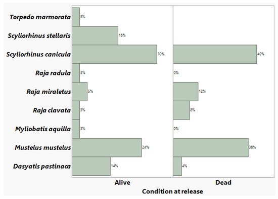 The condition at release exhibited minor, though non-significant, differences among captured species (Figure 3). Among the surviving individuals, the small-spotted catshark dominated (30% of all live releases), followed by the common smooth-hound (24%) and S. stellaris (16%). Mortalities were primarily from the common smooth-hound (36% of all dead) and the small-spotted catshark (40%). R. radula and Myliobatis aquilla contributed minimally to live releases (3% each) but showed complete mortality (0% survival).