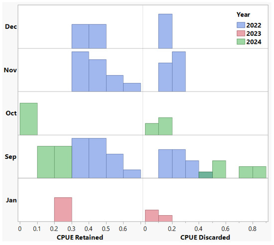 The distribution of the CPUE is presented across five months, September, October, November, December, and January, stratified by year. The CPUE values are separated by retained and discarded fractions of the catch. Differences in CPUE distribution are observable across months and years, providing an overview of temporal variation in catch dynamics and discard patterns over the course of the study period.