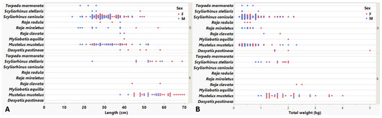 The comparative (A) length (cm) and (B) weight (kg) of retained (R) and discarded (D) fractions for each elasmobranch species (N = 194 individuals) from 48 trawl surveys in the Eastern Aegean Sea, September 2022–October 2024. Sex is indicated by color (female: blue, male: red). This figure illustrates size-selective fishing practices, with larger individuals (M. mustelus, R. clavata) more likely to be retained, supporting the need for selective gear modifications.