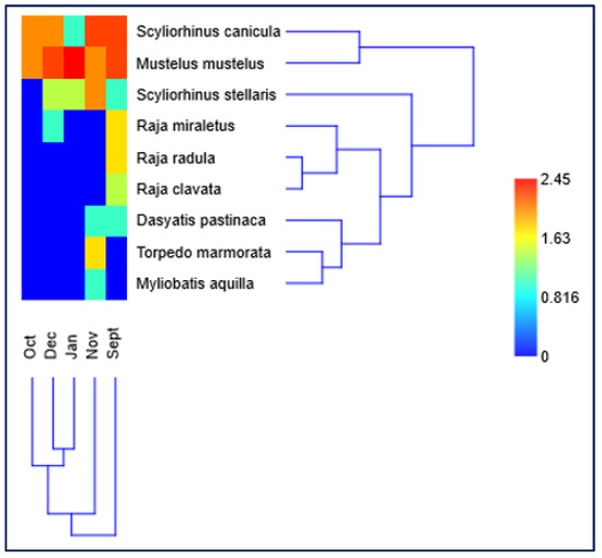 The species dendrogram (Figure 8) revealed two primary clusters. The first cluster exhibited higher temporal clustering, with September clearly distinct from other months, displaying unique species composition and abundance patterns. The second cluster encompassed October, December, and January, forming a closely related group that suggests similar elasmobranch assemblages during these months. November showed intermediate similarity, bridging the two main clusters.