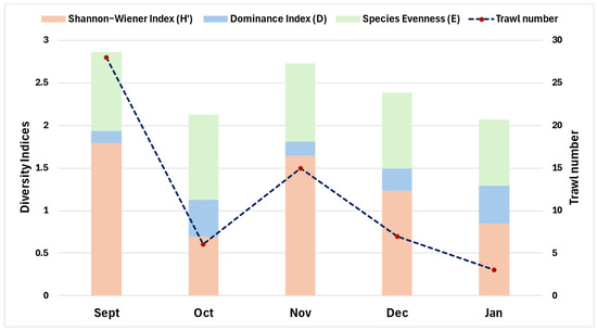 The monthly variation in diversity indices derived from elasmobranch abundance data and corresponding trawl efforts between September 2022 and October 2024 in the Eastern Aegean Sea. The stacked bar chart illustrates the Shannon–Wiener Diversity Index (H′), the Dominance Index (D), and Species Evenness (E). The superimposed dashed line with red dots represents the number of trawl operations conducted each month.